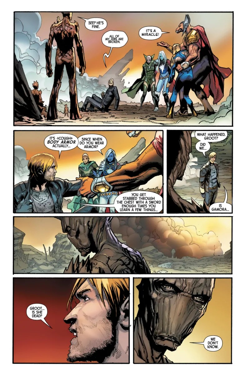 It seems like no one stays dead anymore in the Marvel Universe. In the first issue of War of the Realms, Marvel killed off both Loki and Odin, but then they immediately announced that Loki would star in a new ongoing series, while Odin was back the next issue. So when Star-Lord was apparently killed in the last issue of Guardians of the Galaxy, it was only a matter of time before he came back. But did it have to be the very next issue? See Star-Lord survive in this preview of Guardians of the Galaxy #5…