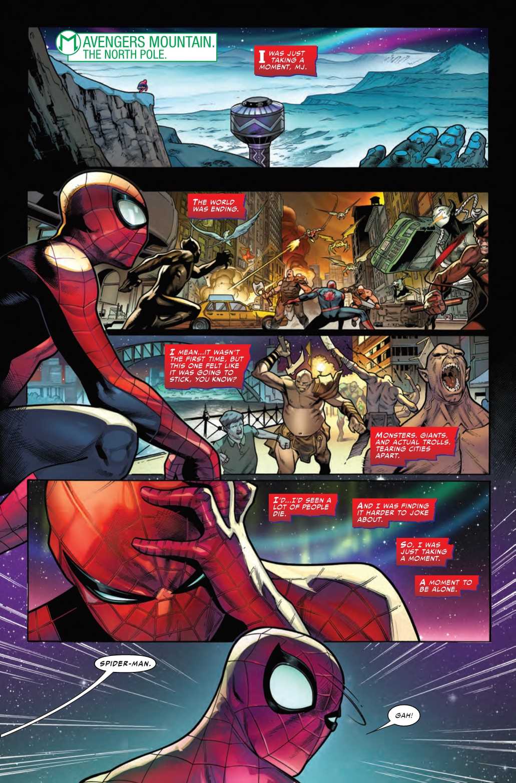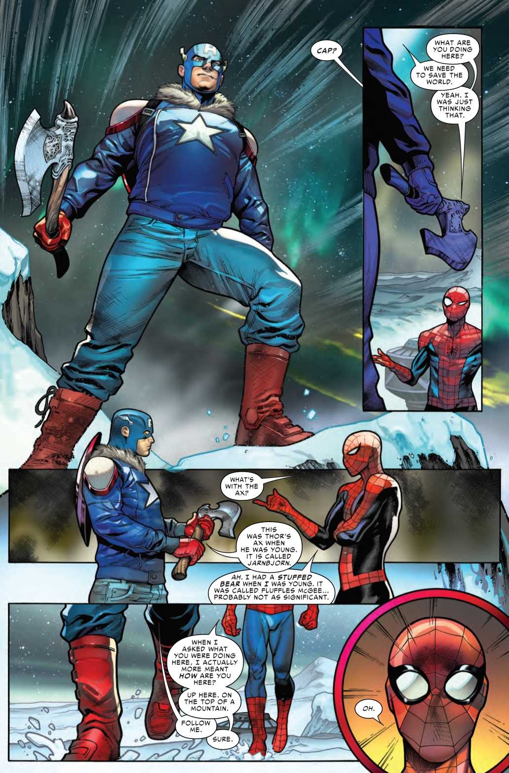 The War of the Realms is Marvel’s biggest-ever super-mega-crossover event, and it’s one that has already had a transformative effect on the Marvel Universe, with Earth’s heroes failing to defend against the initial invasion of Malekith’s armies, leaving the surviving forces to attempt to mount a resistance against impossible odds. But just because war is horrible doesn’t mean there can’t be some nice moments too, as we see in this preview of War of the Realms: Strikeforce: Land of the Giants #1, as Spider-Man meets Captain America on a frigid mountaintop… and wonders how he got there.