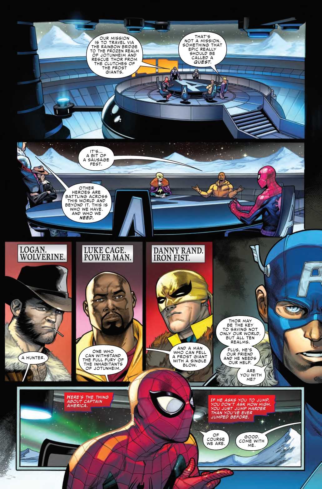 …And it’s up to Captain America to rescue him before all is lost! Taking up Thor’s ax, Jarnbjorn, Cap and his team-Spider-Man, Wolverine, Luke Cage and Iron Fist-invade the Frost Giant realm in search of their fellow Avenger. But this rescue mission will cost far more than they expect.