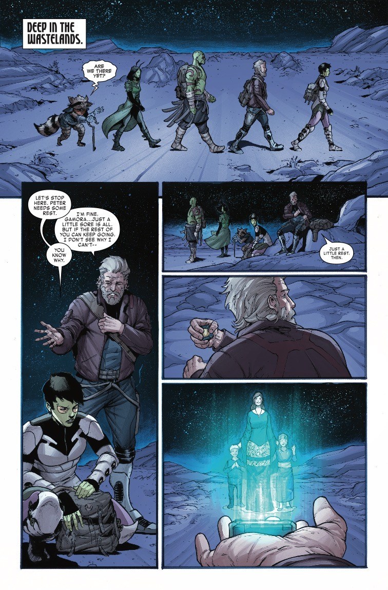 The Guardians stop for a rest on their trek through the Wastelands because, well, Peter is old. And it’s there that he takes the opportunity to look at a hologram of his family…