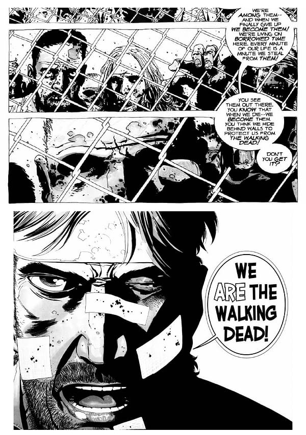Today’s The Walking Dead #190 changes everything. The new issue by Robert Kirkman, Stefano Gaudiano, Cliff Rathburn and Charlie Adlard may mark the end of the second act of the longrunning zombie post-apocalypse storyline, and the beginning of the third. There is a moment that previously played out many years ago, where Rick Grimes spells out the big theme behind the series, as humanity fights with the zombie hordes.