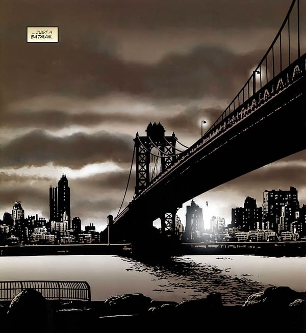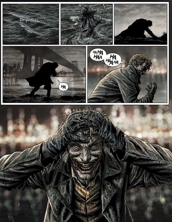 The Joker, provoked by Batman’s taunts, shoots Frost in the chin, disfiguring his face into a grotesque ‘smile’. The Joker and Batman fight on eternally as Frost climbs over the edge of the bridge and falls into the river, seemingly avoiding his fate to become one of them. The page below is from Joker.
