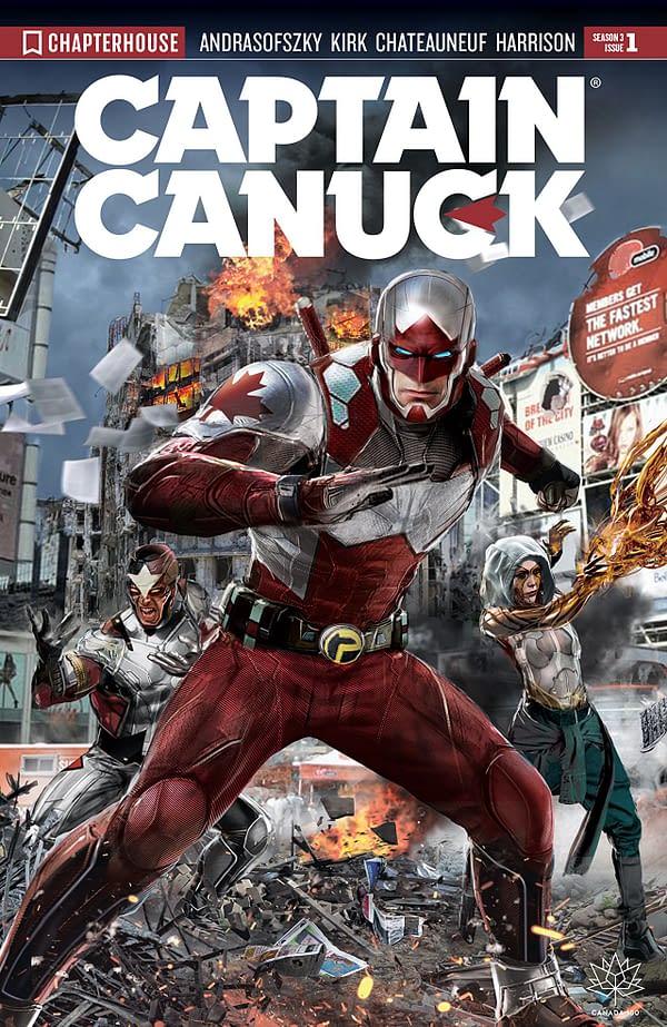 Over the weekend, we looked at John Gallagher‘s work on a variety of Transformers comic book covers, that appeared to be filtered shots of the Transformers toys, or other Transformers artists work. But it goes further than the plastic-and-metal toy set. Gallagher also did a run of covers on the Chapterhouse comic book Captain Canuck, that received considerable praise and attention.