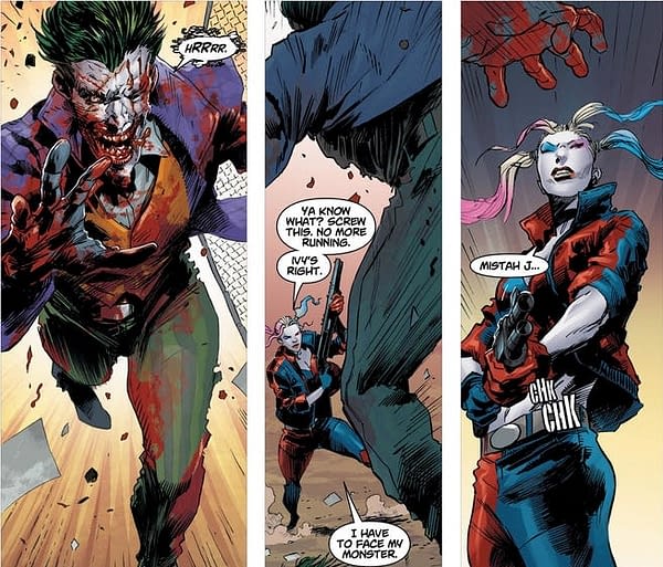 In tomorrow’s issue of DCeased, DC’s answer to Marvel Zombies which Marvel answered with more Marvel Zombies, the Joker finally gets what’s coming to him, courtesy of Harley Quinn. In the preview, we see a zombified Joker attempting to eat Harley’s brains… and Harley isn’t having it!