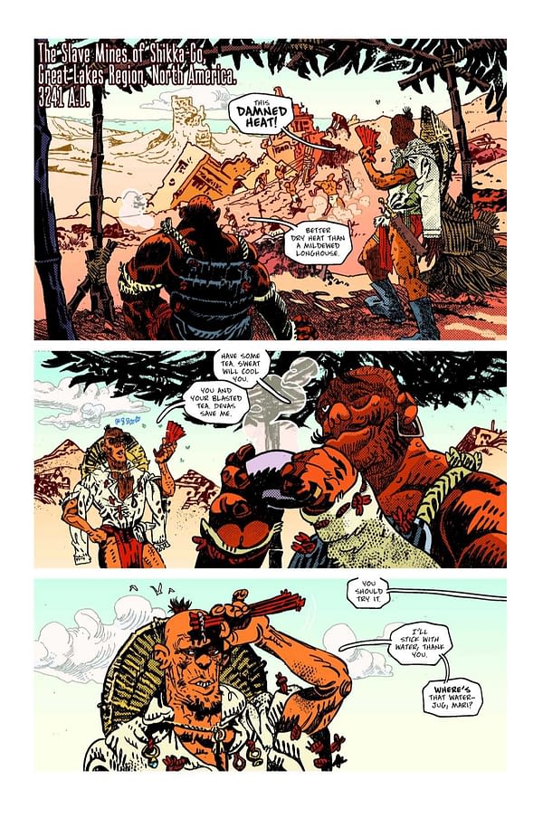 Roy added: “I’ve always been a big fan of Artyom’s work, and when we started talking about some sort of collaboration, I immediately thought of the Far-Future Iron-age adventure Daniel and I had been workshopping years earlier. Once we actually started work on the project, choosing Jason—who I had met and collaborated with, back in art school, and who had already started working with Artyom on Turncoat—for colors was a perfect fit!”
