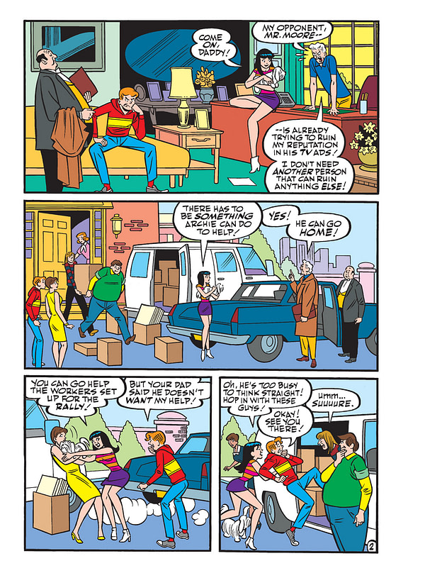 That story is called The CamPAIN!, and sees Veronica's father run for City Council. When Archie visits Veronica at campaign headquarters, he is bitten by the political bug and wants to join the campaign. However, Mr. Lodge has a severe lack of confidence in Archie's ability and refuses to let him help. Unfortunately, Veronica doesn't listen to her father and sends Archie to help set up a campaign event anyway. Will Archie screw everything up and cost Lodge the election? We presume so, but we'll have to buy the comic to find out.