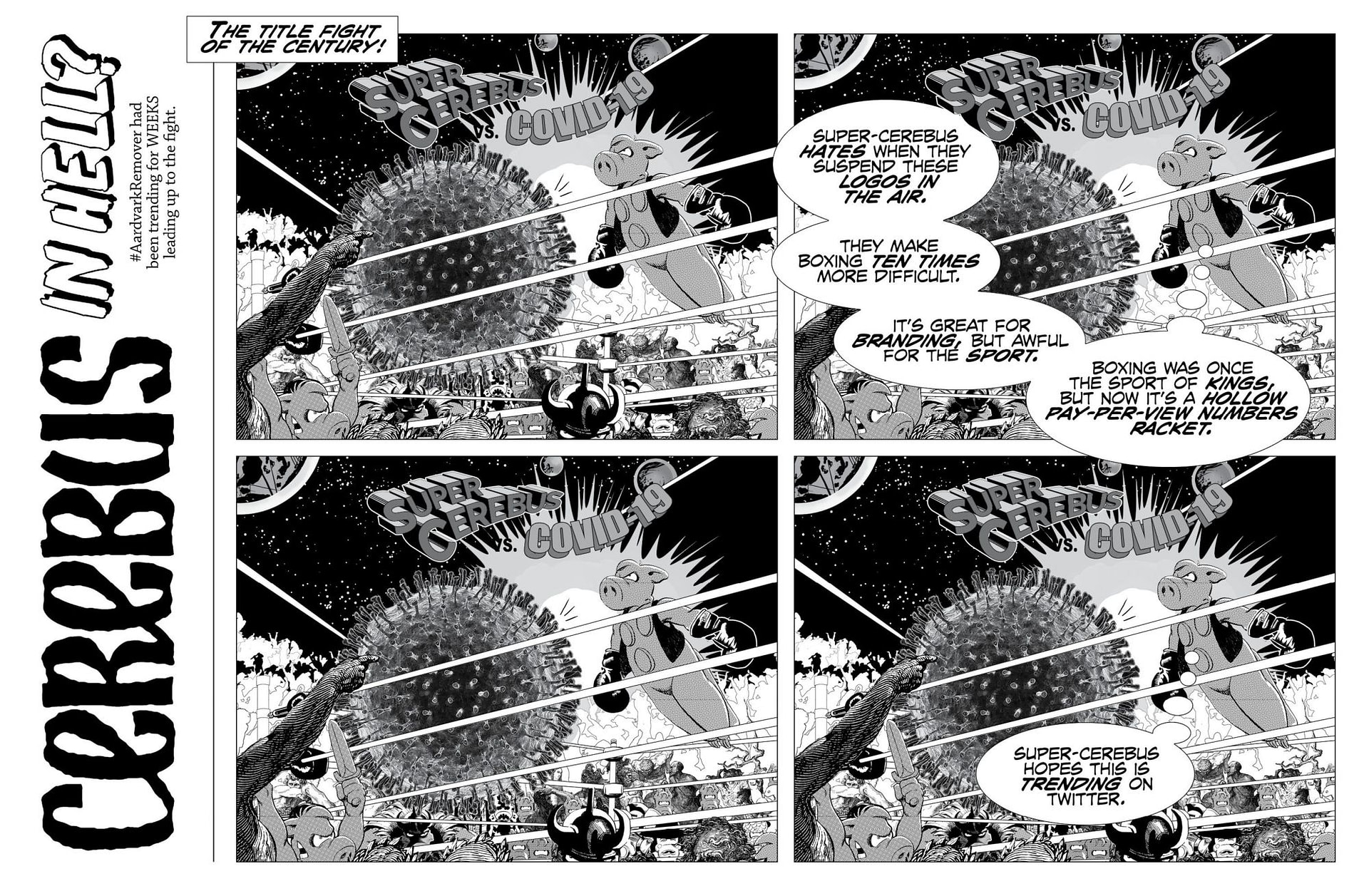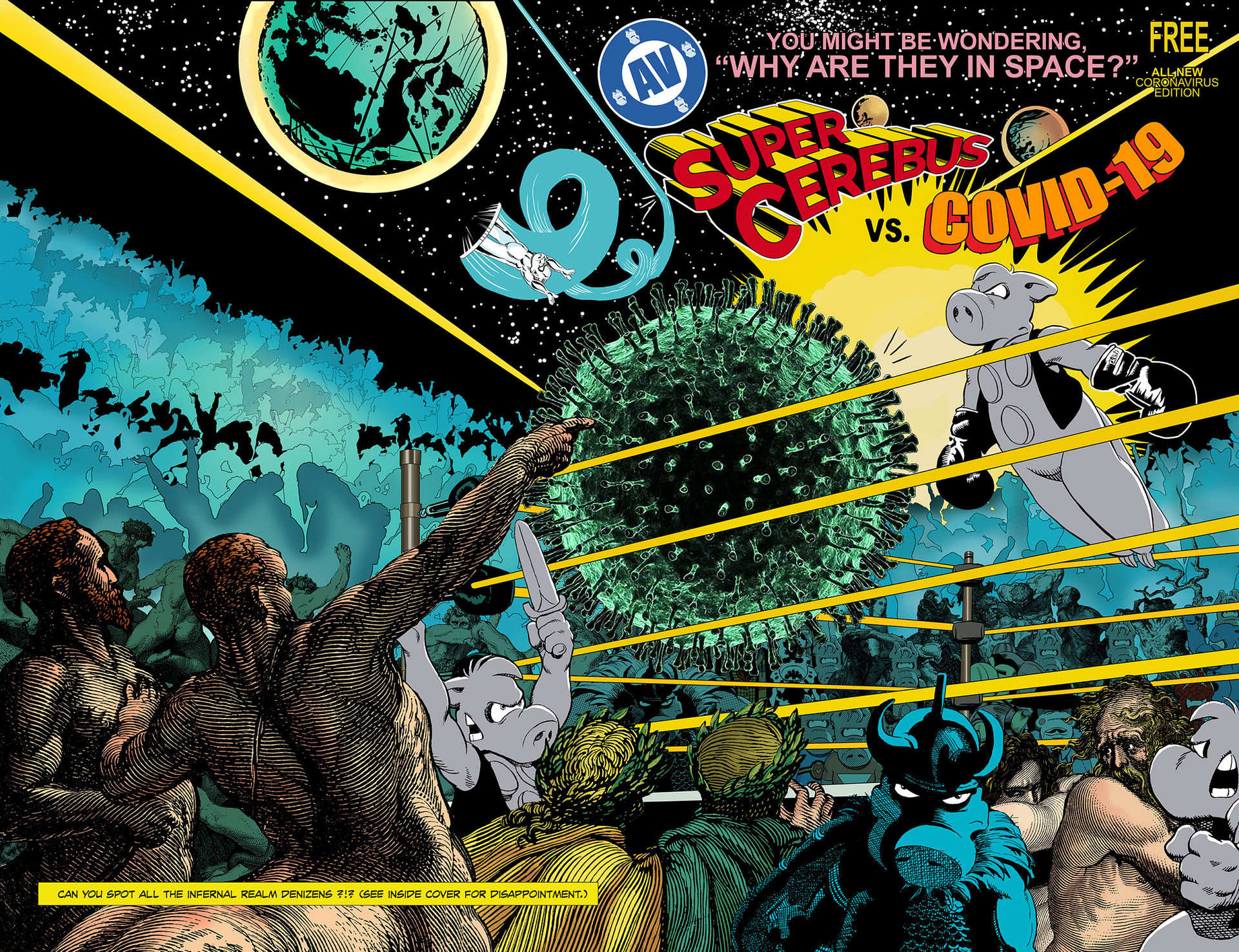 His third such free volume is called Super-Cerebus Vs. Covid-19 and it parodies Neal Adams' Superman Vs Muhammad Ali. Cerebus takes the Superman role, Covid-19 takes the Ali role. The comic plays out a boxing match between the two, before getting bored and going back to Cerebus' cell in hell, where he is rooming with Covid-19. Because of course he is.