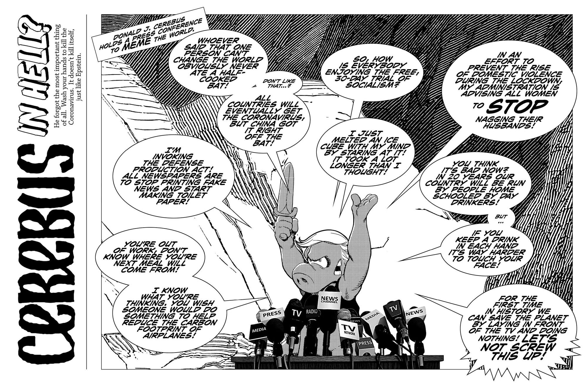 Not again?!? Yes, we're afraid so… and this time… there's BOXING. No really, several pages of it. There's even low class types running the whole thing and VEGAS-style bets, just like in the Real World! Look, we're really tired so if there is an oddball conspiracy theory about SWEAT (yeah, that stuff under your arms) and a few phallic jokes we hope you'll let it slide. Social Distancing is still being defined on a daily basis. CEREBUS is your go-to-guy for answers to your Frequently Asked Questions about Covid-19. More from the irrepressible Donald J. Cerebus. And we meet a new enemy. An enemy so dangerous that… well, maybe we'll find out if said enemy can settle up with the UPS guy.