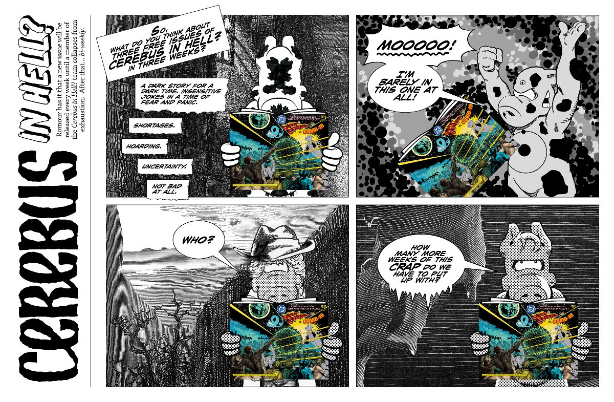 The comic also gives us the Donald J Cerebus character in this time of trial. It comes free with possibly the most tone-deaf comment about the pandemic's reported effect on domestic abuse. Will putting such words in the mouth of Donald Trump Cerebus make the intent ironic, or is it just a way of slipping in a seventies-style gag to a modern audience, in the manner of Jimmy Carr? I'm sure Sim will be providing a full refund to anyone who asks.
