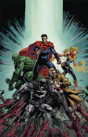 As writer Simon Spurrier jumps on board for the start of the three-part tale "The Rule of War," it's close encounters…of a Justice League kind! After answering a distress signal from distant space, Batman, Superman, Wonder Woman, the Flash, and Green Lantern discover an abandoned cargo ship full of young aliens! When the League attempts to return the children to their home planet, they are met with awe, terror, and war! Thus begins a three-part storyline that will take the League to a previously unknown planet, with an all-new species, a dangerous mystery, and a new, otherworldly villain.