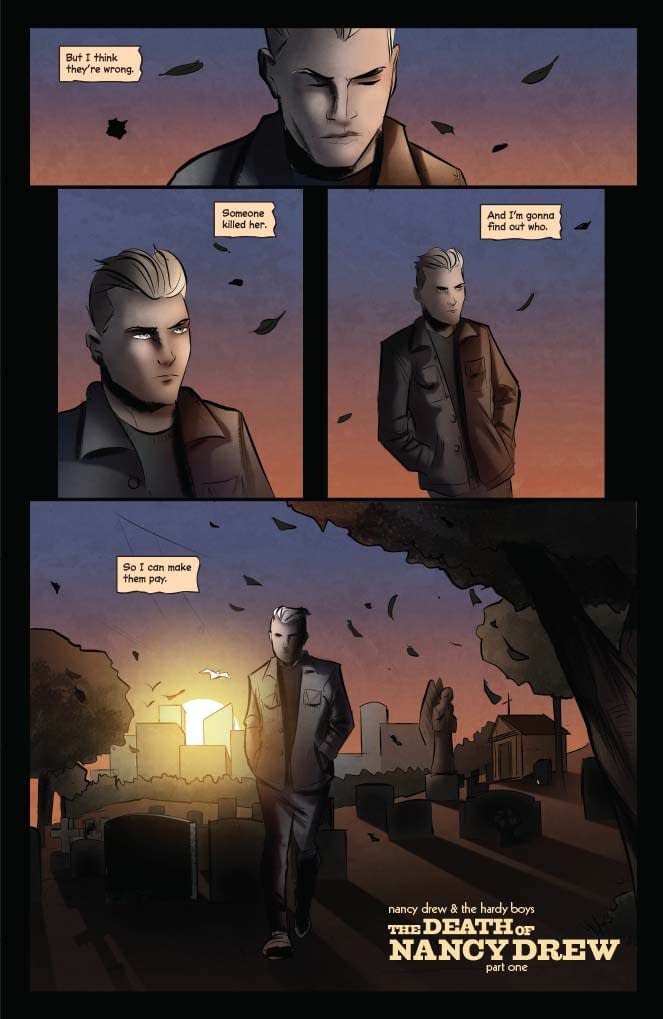 In the first series (The Big Lie), the issues were either narrated by Nancy or Frank/Joe. As I sat down to write this first issue I realized that it (the issue) would be more effective to come from only one person – Joe. I wanted him to have the classic Sam Spade/Phillip Marlowe noir approach – the detective that will do whatever it takes to solve the crime, even if it means alienating family members (you'll have to read the issue to find out what I mean!). When there are three main characters it's always tough to balance the perspective but I think as it goes on we do a good job of it (again, kudos to editor Matt Idelson for making sure everything was on track!).