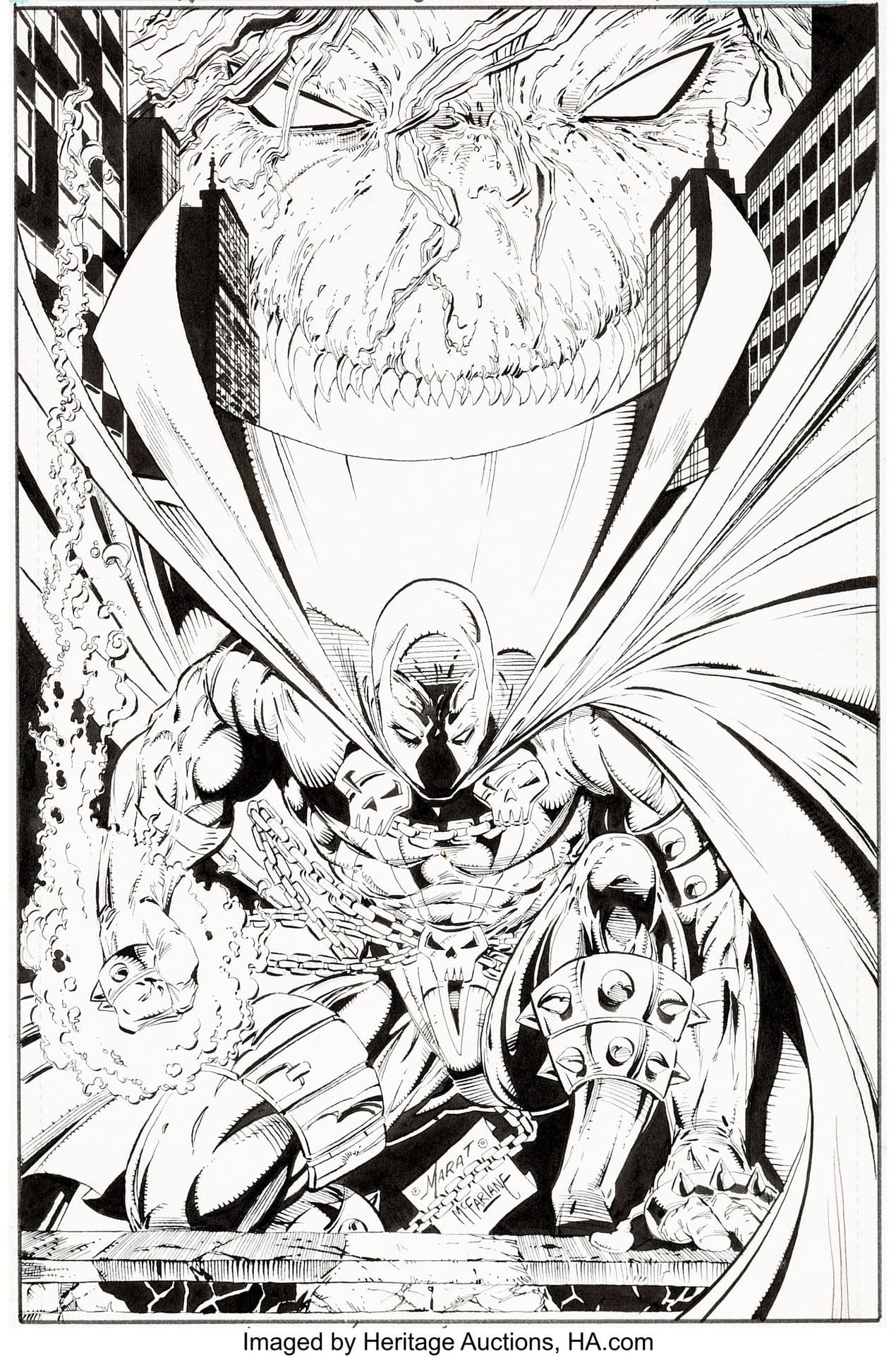 This is the only piece of original McFarlane Spawn art ever to be sold from 1992, the year of its debut. The next closest such art on the market was from issue 20 from 1994. The piece is signed by McFarlane in his famous "scroll" signature, and also signed by Mychaels, twice. The piece is ink over pencil on Bristol board with an image size of 10.25" x 15.5".