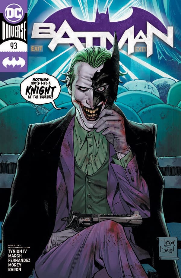 In the last week, I have received a number of notes from people worried, concerned, annoyed, or curious about the upcoming cover to Batman #93, especially not that it has received its full livery. Featuring the Joker, with a half-Batman mask, sitting in the cinema, bloodied, holding a gun in his mask. With the phrase 'Nothing quite like a knight at the theater'.