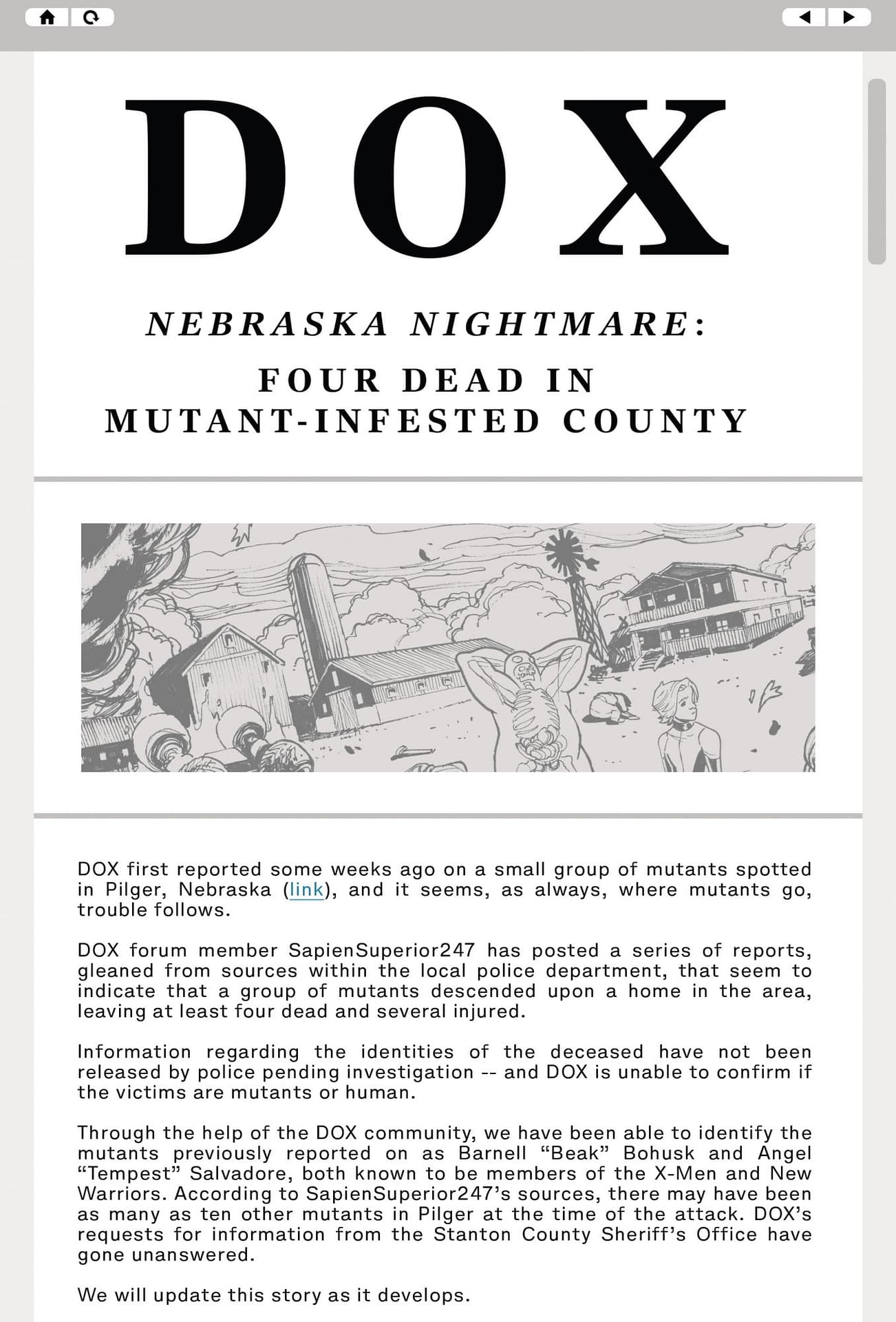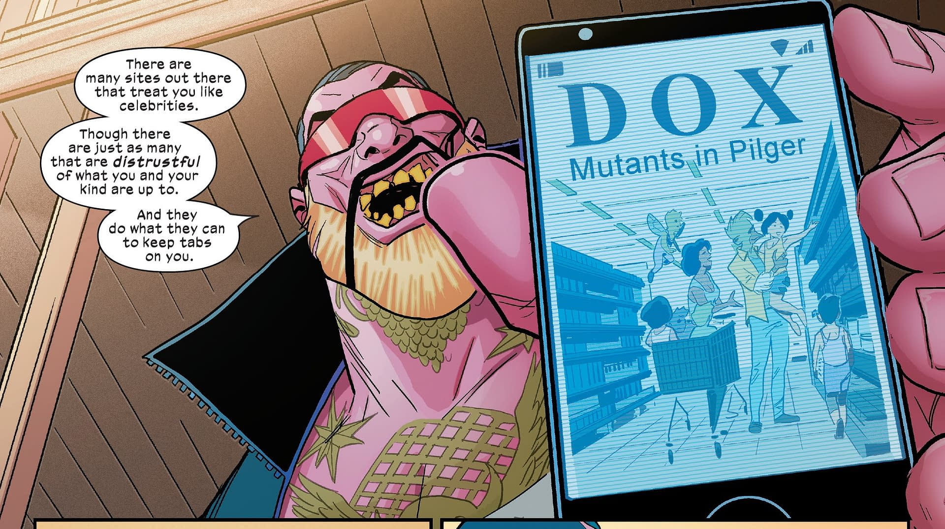 The issue of New Mutants out today sees the team dealing with an out-of-control mutant in a Marvel Universe fictional Eastern European country Carnelia (first appearance in Iron Man #117 in 1978, fact fans). And it's also the latest impact of the factional website DOX, which details the latest actions of mutants, in a very derogatory fashion, and encouraging anti-mutant sentiment, with street addresses and photographs to boot. We've seen how this has gone done before.